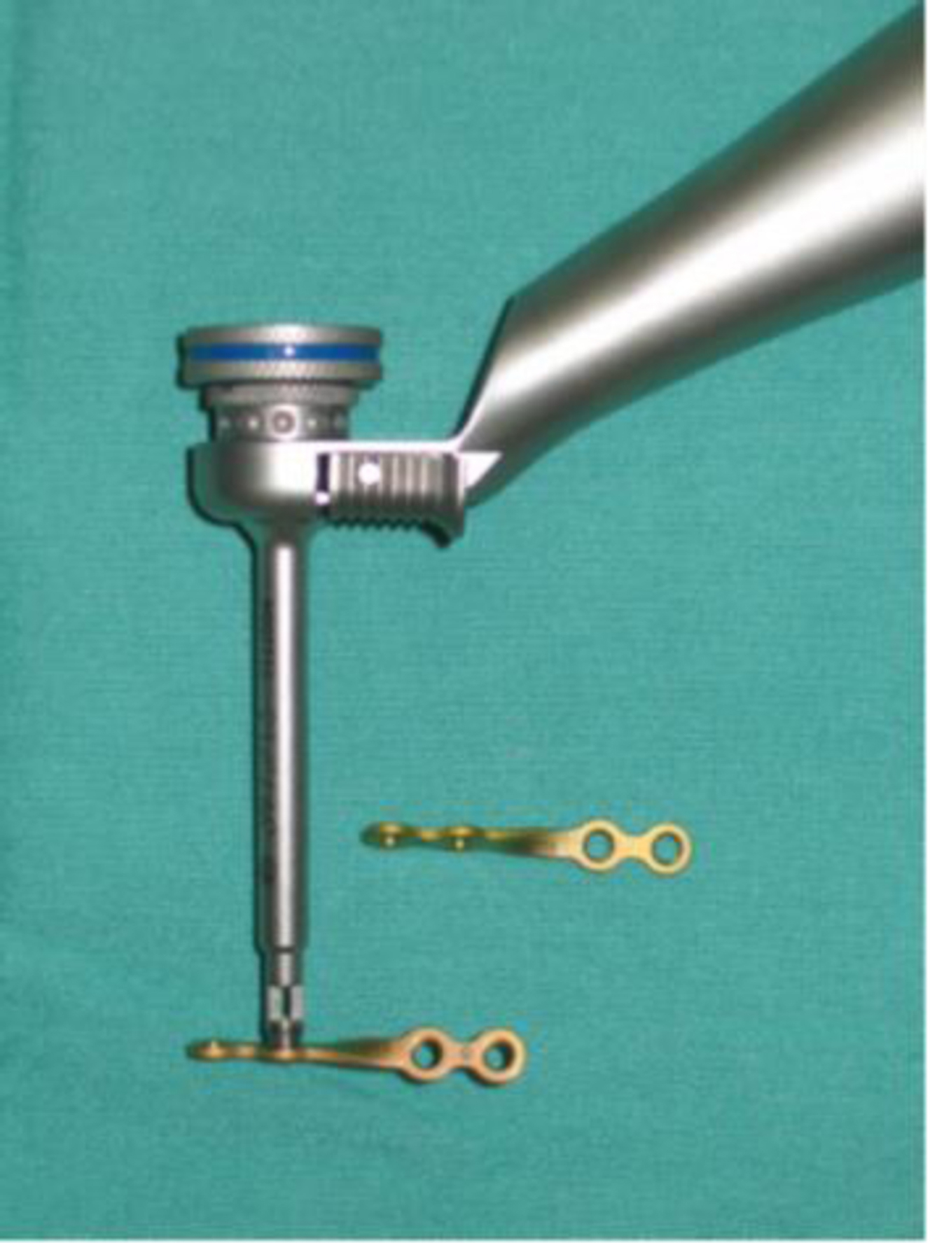 When approaching a MAF, several important factors must be considered. A key determination is the presence or absence of other mandibular fractures. The presence of other fractures may determine the order or technique of the approach. For instance, if there is a nondisplaced contralateral condyle fracture, this circumstance portends the need for guiding elastics, and the use of Erich arch bars will likely be the first step in fracture repair. Angle fractures are usually “retro-occlusal” in that they occur behind the articulated dentition. Therefore, if other fractures are present in the dentate segment of the mandible, it is these “occlusal” fractures that strategically are approached first. Fractures of the mandibular angle are often approached transorally through an incision proximate to the retromolar trigone or through a gingival incision that is described for third molar extraction. In the case of an isolated angle fracture, the fracture is typically completely exposed, and reduction is attempted before placing the patient into maxillomandibular fixation. Yet, maxillomandibular fixation would typically be a prerequisite to plating of the fracture as MMF is typically beneficial to achieving optimal fragment reduction. Temporary MMF techniques include the use of intermaxillary fixation (IMF) titanium screws, the use of Ivy loops, or the use of Ernst ligatures along with several other methodologies including a type of zip tie or embrasure wires. The instrumentation for the transoral approach to the angle uses transbuccal trocars for the plate and screw placement. It is beneficial to use threaded locking plates in the repair because the threaded locking plates can be secured directly to the transbuccal trocar to allow control of the plate while the repair is being secured and for drilling screw holes ( Fig. 1 ). Headlights and surgical magnification using loupes or endoscopes can improve visualization during the repair.