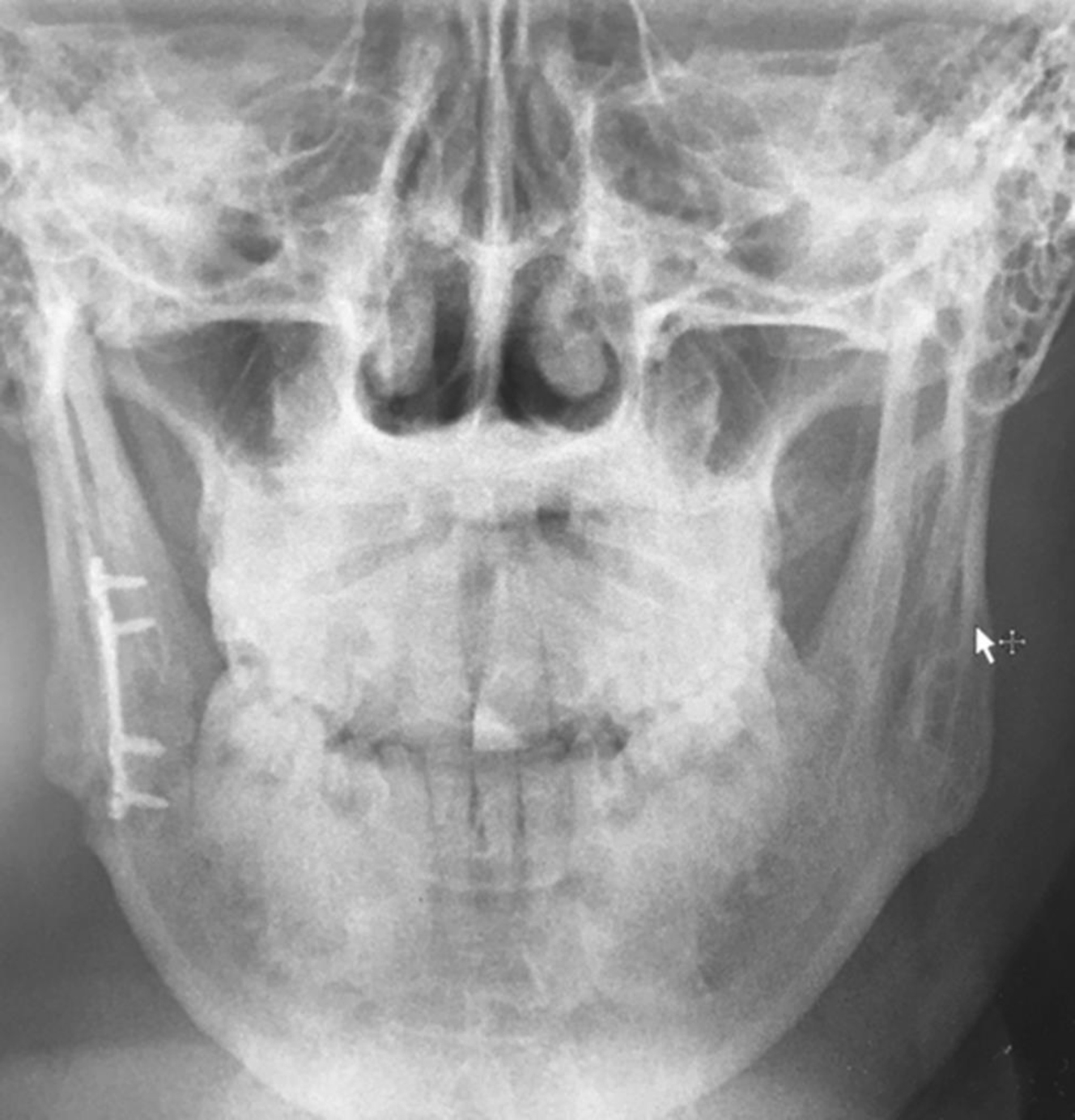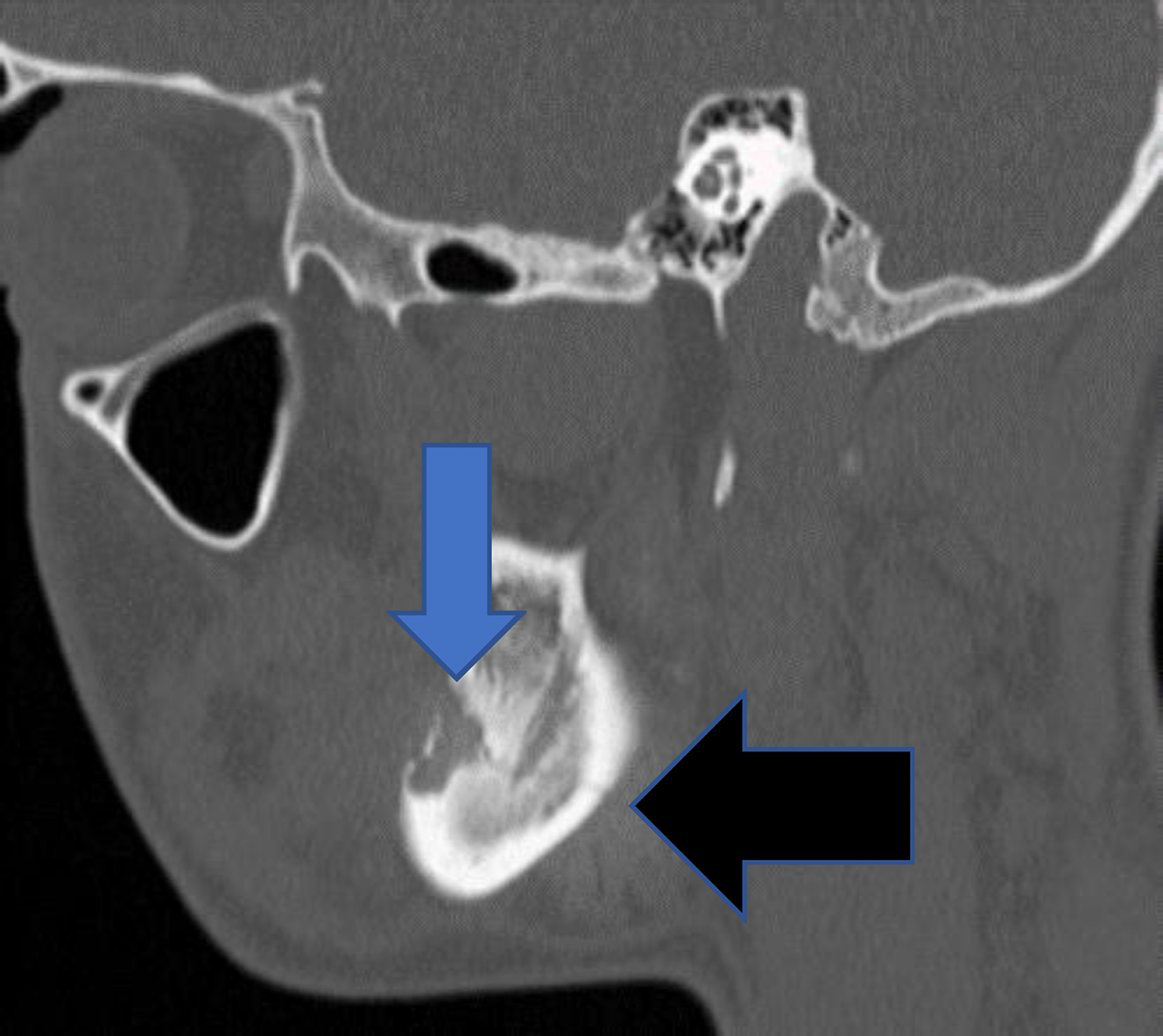 Once a mandible fracture is suspected based on history and physical examination, there are several diagnostic imaging modalities that can be used based on availability. Panorex plain films (orthopantomogram) in combination with a posterior-anterior plain film will provide two views of the mandible which would show an MAF, while a panorex radiograph alone may miss a posterior fracture. However, the equipment to obtain panorex views tends to be of limited availability in the hospital-based emergency room setting, and thus, a mandible series of radiographs or CT have been adopted as the gold standard. A mandible series includes three views: posteroanterior, oblique, and lateral. However, these three views may not clearly visualize the condyles. CT imaging has become the modality of choice and has been shown to have a 100% sensitivity to detect all fractures of the mandible. CT also has the advantage of assessing the involvement of tooth roots in the line of fracture, the presence of severe dental disease, and also screens for other facial fractures. Additionally, CT scans can be used to produce three-dimensional reconstruction which can help with operative planning or the selection of patient-specific plating if necessary.
