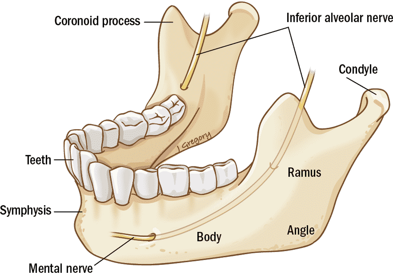 The mandible is a U-shaped structure that frequently fractures in multiple locations although single fracture sites may occur. Mandibular trauma often accompanies other facial fractures or closed-head injuries. The mandible consists of the condyle, coronoid process, ramus, angle, body, and symphysis, as shown in Fig. 1 . In this article, the authors focus on fractures of the mandibular body. The body of the mandible encompasses bone from the canine or incisive fossa to the angle of the mandible and contains the molars and premolars.