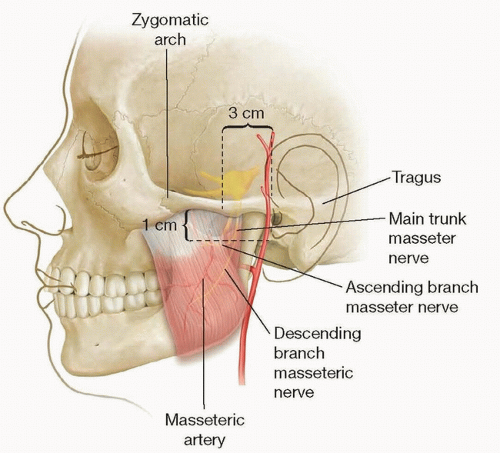 The main trunk of the masseter nerve can be identified at a point 3 cm in front of the tragus, 1 cm below the zygomatic arch, and 1.5 cm deep to the SMAS (FIG 1).1