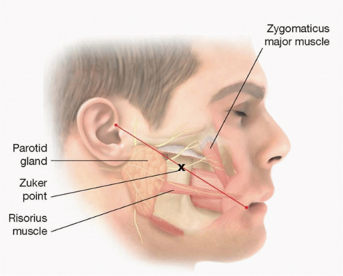 FIG 2 • The facial nerve branch supplying the zygomatic major is typically found at a point half way between the root of the helix and the lateral commissure.