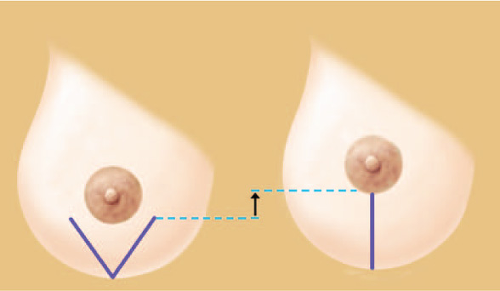 Patients primarily seeking breast augmentation but have low nipple position, enlarged areolar diameters, or nipple position asymmetry may require mastopexy only as a limited adjunct. Although conservative circumareolar mastopexy usually suffices in these cases, a vertical component may be required on one side if significant nipple position asymmetry exists (Fig. 1).