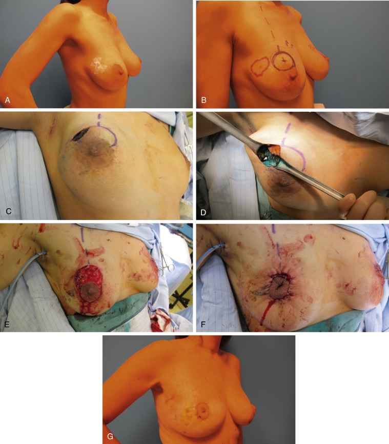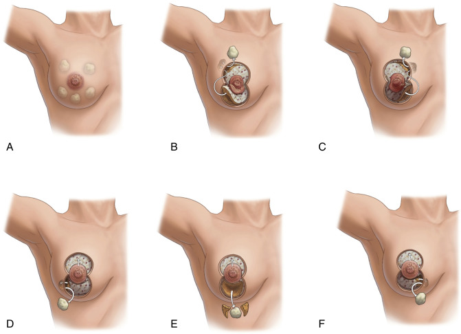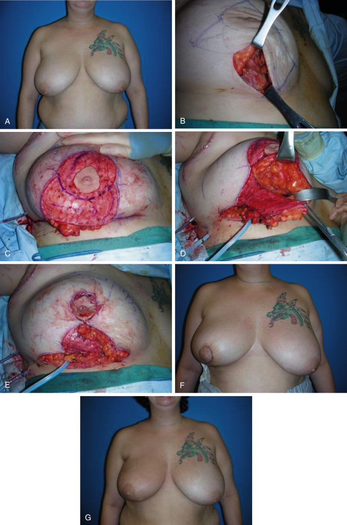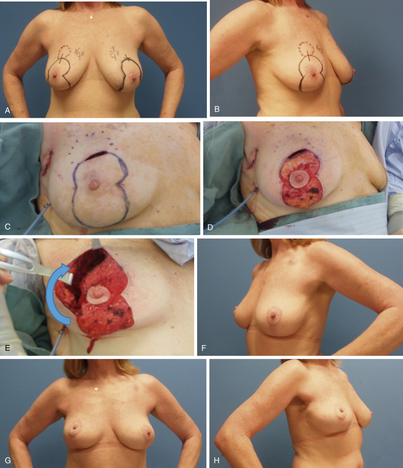 In patients with C-cup breasts with upper quadrant tumors with some degree of breast ptosis, displacement concentric mastopexy can be an ideal option for repair ( Fig. 9.1 ). The advantage is that the repair elevates the position of the nipple–areolar complex (NAC) and displaces the lower pole breast tissue to fill upper pole defects. After radiotherapy, the region of the defect may be fat grafted and the contralateral breast may be made smaller with direct liposuction or surgical excision of skin and fat. However, because the defect is repaired before radiotherapy, there is not usually a localized deformity, only a diffuse volume loss to the breast from radiotherapy. Therefore, most often, the second stage of this repair involves fat grafting to the entire breast after radiotherapy to replace the diffuse volume loss and minor adjustment to the contralateral breast for symmetry.