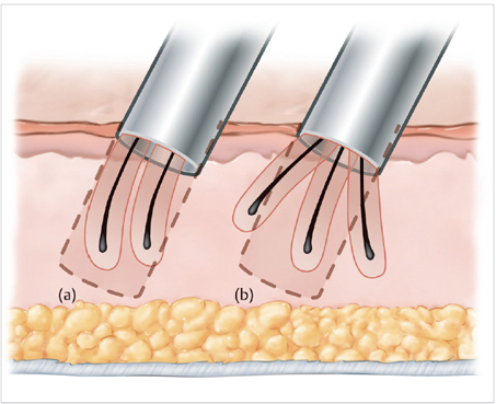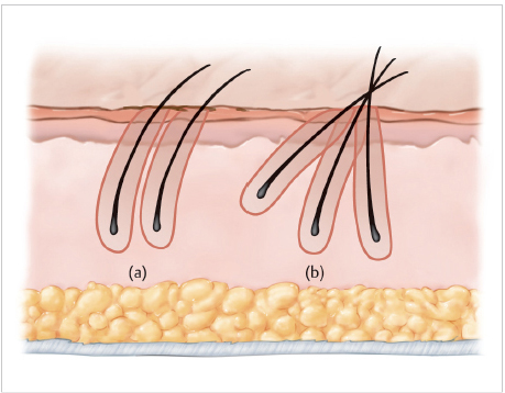 Fig. 56.1 The subcutaneous course of the follicles in the target group can be characterized by various degrees of (a) curl and (b) splay as seen in these illustrations.