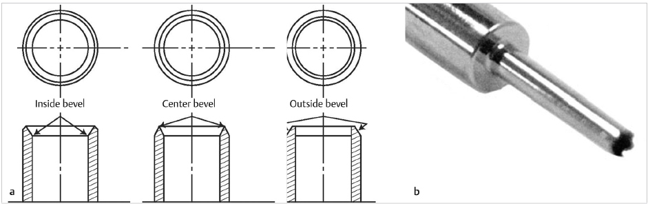 Fig. 56.2 (a) The cutting edge of sharp punches can be located in the outer, middle, or inner aspects of the punch wall. (b) The Cole Instruments Serrounded punch has a unique shape to the leading edge of the punch.