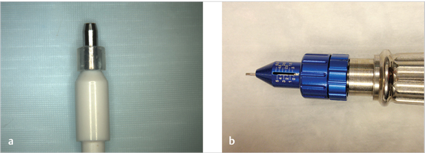 Fig. 56.4 Examples of depth limiting methods. Limitation can be accomplished (a) by spacers placed onto the punch or (b) by an adjustable mechanism on the device.