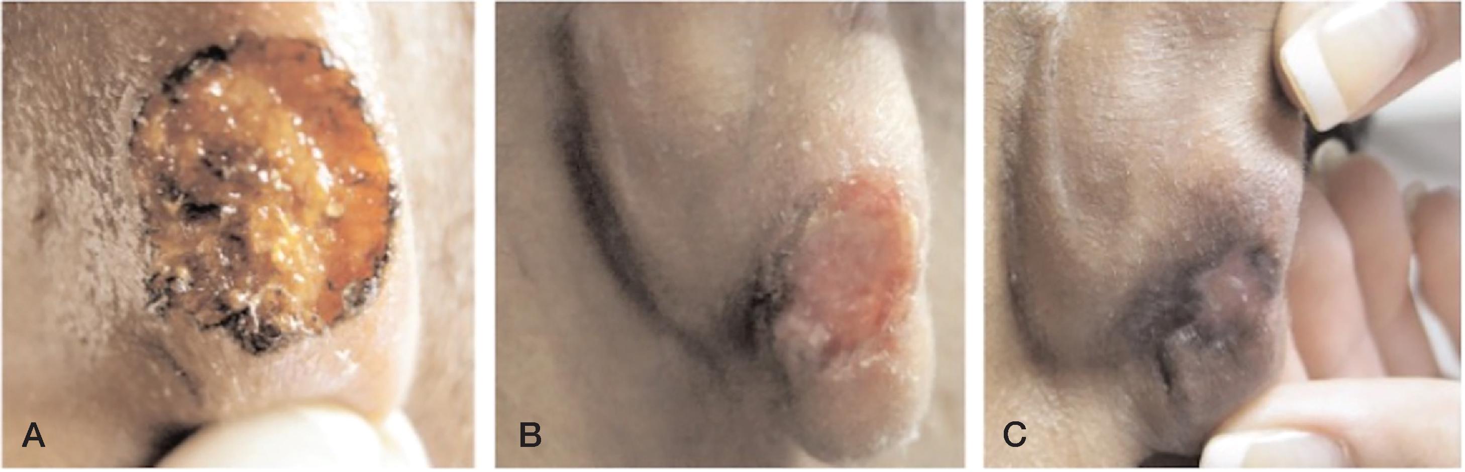 (A) Postoperative appearance of earlobe keloid on day 1. (B) During imiquimod therapy, yellow inflammatory crusting and granulation tissue noted (postoperative day 30). (C) Resolution of inflammatory response on postoperative day 42.
