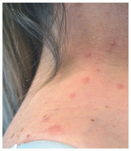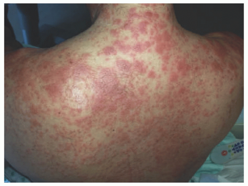The eruption typically begins on the trunk as scattered, small erythematous blanching papules (Figure 28-2). Over the next several days, these papules progress in a centrifugal pattern. Centrally, the papules fade to macules and coalesce into patches. This eruption generally does not affect the face, palms/soles, cause lymphadenopathy, nor is it associated with an enanthem. These features would be suspicious for severe cutaneous adverse reactions or a viral etiology.16,17