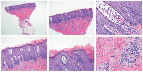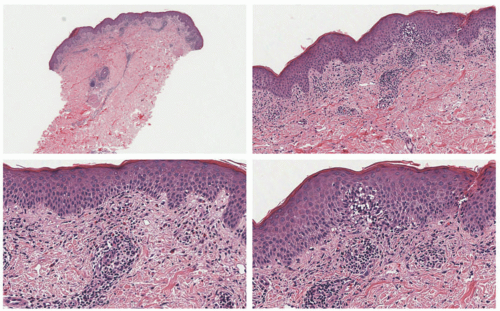 The histology of these eruptions is not specific, but typically the inflammation is perivascular and is confined to superficial dermis, containing lymphocytes with or without eosinophils and neutrophils (Figure 28-3).18 A total of 50% of cases may have associated interface changes, and similarly, only 50% of cases have eosinophils present in the inflammatory infiltrate.15