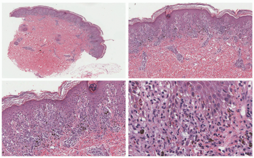 Pathologically, this eruption will look very similar to that of Stevens-Johnson syndrome with an interface dermatitis and keratinocyte necrosis that can be full thickness. In contrast to Stevens-Johnson syndrome, eosinophils may be more abundant, and often pigment dropout and melanophages will be visible from a previous reaction (Figure 28-4).