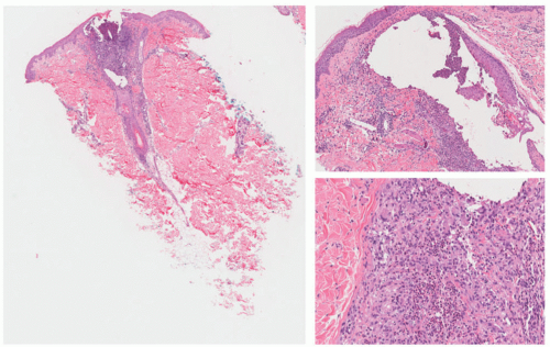FIGURE 28-5. Acneiform eruption in association with epidermal growth factor receptor inhibitors. A pustular folliculitis and perifolliculitis is present. At the edges of the inflamed follicle, focal granulomatous changes are present.