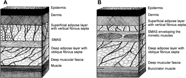 Evaluation of the microscopic anatomy of the melolabial area reinforces the findings of gross dissection. The following structures are encountered in sequence as the analysis moves from superficial to deep layers: epidermis, dermis, superficial adipose layer with vertically oriented fibrous septa, SMAS (a laminar layer of connective tissue), deep adipose layer with obliquely oriented fibrous septa, and deep (muscular) fascia ( Fig. 1 ). While moving from the lateral cheek to the melolabial crease, the superficial adipose layer and SMAS thin, whereas the deep adipose layer thickens. Additionally, the SMAS envelops the mimetic muscle of the medial face. Thus, the vertically oriented fibrous septa found within the superficial adipose layer connect the SMAS to the dermis and transmit muscular movements to the skin. This transmission allows the facial skin to move and express emotions.
