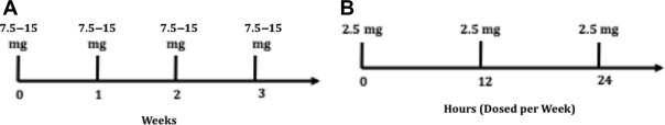 MTX is manufactured as oral tablets or intramuscular, intravenous, or intra-arterial injections. The tablet form is 2.5 mg MTX disodium, whereas the injection is 25 mg/mL MTX sodium. The recommended starting dose schedule for psoriasis is a once-weekly, low-dose schedule of either a single oral, intramuscular, or intravenous 7.5- to 15-mg per week dose until adequate response is achieved or a divided oral dose schedule 2.5 mg at 12-hour intervals for a total of 3 doses ( Fig. 4.1 ). Some physicians recommend a test dose as low as 5 mg for the first week of treatment. Dosages should be adjusted to the individual patient (ie, reduced doses for decreased renal function, the elderly patient, or persons with low body mass index vs greater doses for those with extensive, intractable disease), while avoiding higher doses. MTX can be used for long-term management of plaque psoriasis and should be continued until optimal clinical responses are achieved. There is not an established maximum dose, although many use 25 to 30 mg as a maximum. Following improvement of lesions, dosages are typically tapered to the lowest effective dose and may be continued long term with adequate monitoring owing to the risk of toxicity. MTX should be kept in an area that is not readily accessible to children. Tablets and injection vials should be stored in areas with little heat or moisture, adequate light protection, and room temperatures 59°F to 86°F (15°C to 30°C). Special care should be taken not to freeze injection vials.