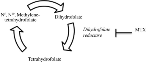 MTX is a folate antagonist that interferes with de novo purine synthesis by inhibiting the enzyme dihydrofolate reductase. This critical enzyme is responsible for converting dihydrofolate to tetrahydrofolate, and its inhibition lowers the synthesis of DNAs, particularly purines and thymidylate. For this reason, MTX effectively hinders cellular replication ( Fig. 4.2 ).