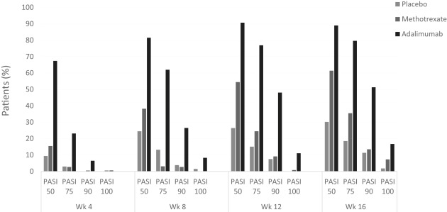 The CHAMPION trial was a phase 3, placebo-controlled study that was the first to compare oral MTX to adalimumab and placebo for the treatment of psoriasis. The study enrolled 271 patients from 28 different sites across Europe and Canada and randomized them in a 2:2:1 ratio to receive MTX, adalimumab, or placebo for 16 weeks. Oral MTX was dosed at 7.5 mg at week 0, increased to 10 mg/wk at week 2, and finally 15 mg/wk at week 4. Patients who achieved Psoriasis Area and Severity Index (PASI) 50 by week 8 were maintained on the 15-mg/wk dose, and those who did not were increased to 20 mg/wk. Any patient not achieving PASI-50 by week 12 was increased to a maximum study dose of 25 mg/wk. Efficacy was defined as achieving a PASI 75 response after 16 weeks of treatment. Patients with prior exposure to TNF antagonists were excluded. The trial demonstrated greater PASI-75 scores for adalimumab (79.6%) to oral MTX (35.5%) and placebo (18.9%) for the treatment of plaque psoriasis. Further analysis of the CHAMPION trial suggests that week 12 may be a crucial time period to decide whether a patient should continue MTX treatment or change to a different medication. Fig. 4.3 demonstrates the efficacy data of the CHAMPION trial.