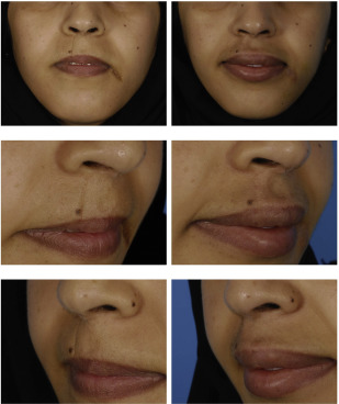 This 27-year-old female patient presented with posttraumatic scars after injury in her childhood on the upper right lip and lateral to the lower left lip ( Fig. 2 ). The vertical scar on the upper lip showed no significant change of pigmentation but a certain degree of retraction. Due to its thin straight line-like shape parallel to the rather poor developed right philtral column, the scar was fairly visible even from long distance. The scar lateral to the left lower lip showed a patch-like appearance with significant hyperpigmentation and tension that troubled the patient. Both scars were mature with no signs of inflammation. Aside from scar correction, the patient also asked for augmentation of the lips. She was informed that the hyperpigmented scar on the left lower lip may be difficult to treat in its color by a single treatment. In 1 surgical session, fat was harvested from the abdominal area. A total of 3 mL of microfat was injected into the upper lip and 3 mL to the lower lip for cosmetic augmentation, which also resulted in a better-defined philtrum as requested. The scar on the upper lip underwent rigottomy and was treated with a total of 1.5 mL of lipoconcentrate. The scar lateral to the left lower lip was infiltrated with 2 mL of lipoconcentrate supplemented by PRP. Postoperatively, the upper lip scar was markedly less visible. The lower lip scar tissue became more flexible and less irritating during opening of the mouth and showed slight improvement in color. The hyperpigmentation was not fully improved, however, and additional surgical sessions may be performed in the future.