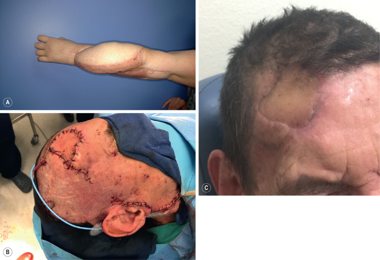 (A) An anterolateral thigh flap was used to reconstruct a dorsal arm wound. This represents poor flap selection. The donor site in the patient was quite thick, and the resulting reconstruction is excessively bulky. In addition, the flap required skin grafting to close the thick edge of the flap that could not be inset. (B) A radial forearm flap was used to cover a wound of exposed cranial bone after craniotomy bone flap plate infection and removal. The area was radiated, and local tissue was not a good option. (C) The flap has good contour, and the pedicle could reach the superficial temporal artery and facial vein. This represents good flap selection.