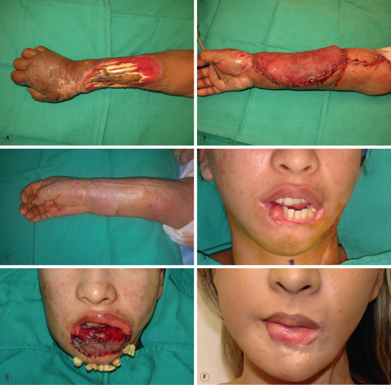 (A) A large forearm wound with exposed bone and necrotic tendon. (B) The wound was debrided, and a latissimus muscle was used to cover the defect. A meshed split-thickness skin graft was placed on the muscle. (C) The muscle atrophied and had good contour. It can be elevated for later bone grafting (as in this case) or for tendon transfer or grafting. (D) A full-thickness loss of the lower lip and orbicularis muscle after necrotizing infection. (E) A functional gracilis muscle was used to reconstruct the orbicularis by innervating to the marginal mandibular nerve while bilateral facial artery musculomucosal flaps were used for lip vermilion. (F) The patient after 1 year has good oral competence and excellent aesthetic outcome.
