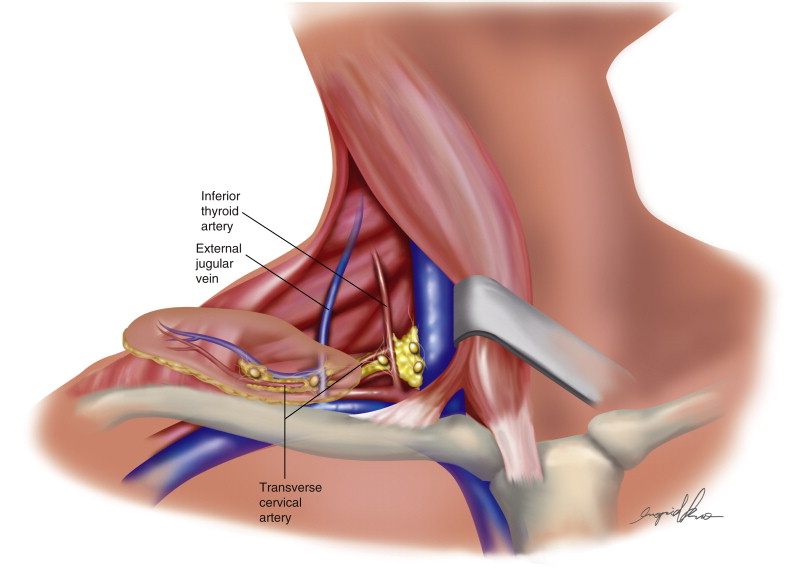 From a clinical standpoint, the American Joint Committee on Cancer (AJCC) and the American Academy of Otolaryngology—Head and Neck Surgery define level V lymph nodes as the posterior triangle group. This includes the supraclavicular lymph nodes. In 2002, amendments were made to this classification suggesting a subdivision of level V into level Va and level Vb. By this designation, level Va nodes are located posterior to the sternocleidomastoid (SCM) muscle, above the horizontal plane defined by the inferior border of the cricoid cartilage, including nodes along the spinal accessory nerve. Level Vb nodes are located posterior to the SCM, caudal to the horizontal plane made by the inferior border of the cricoid cartilage. This group includes the lymph nodes situated along the TCA, previously designated by some authors as a separate, ‘supraclavicular’ group, not included level V. These nodes, of the supraclavicular triangle, are the targets of harvest in this flap’s design.