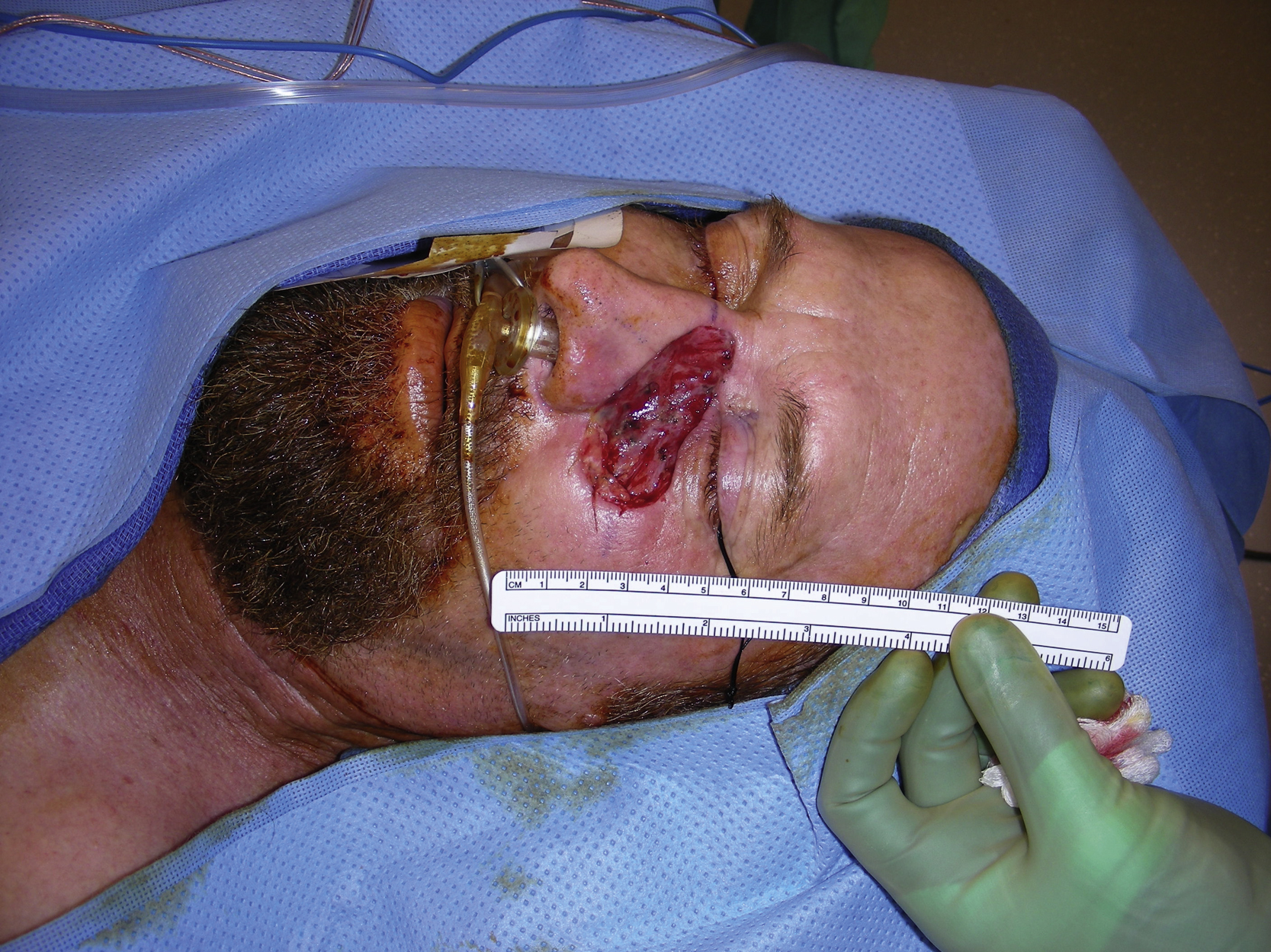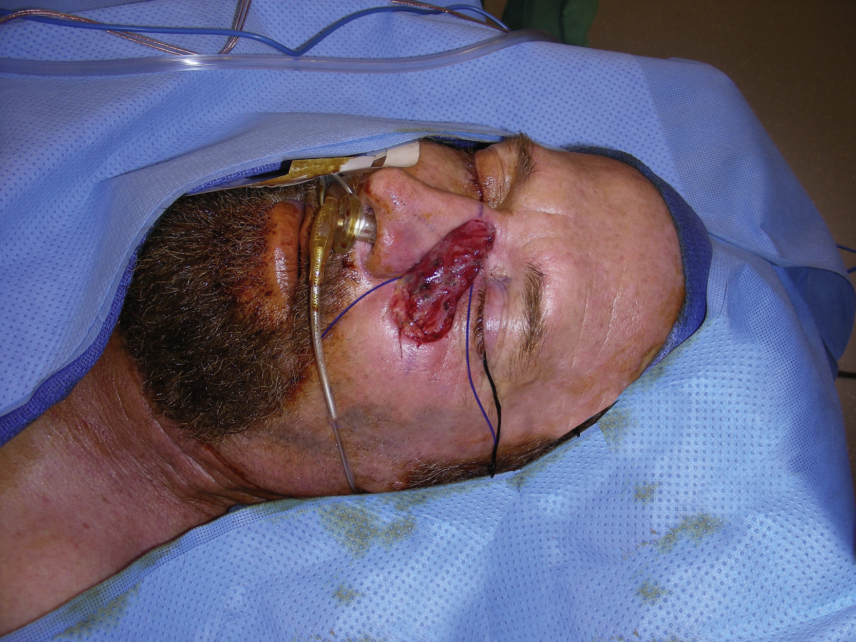 Intraoperative view showing a large skin defect involving the medial cheek and nasal side wall after mons surgical resection with all negative margins.