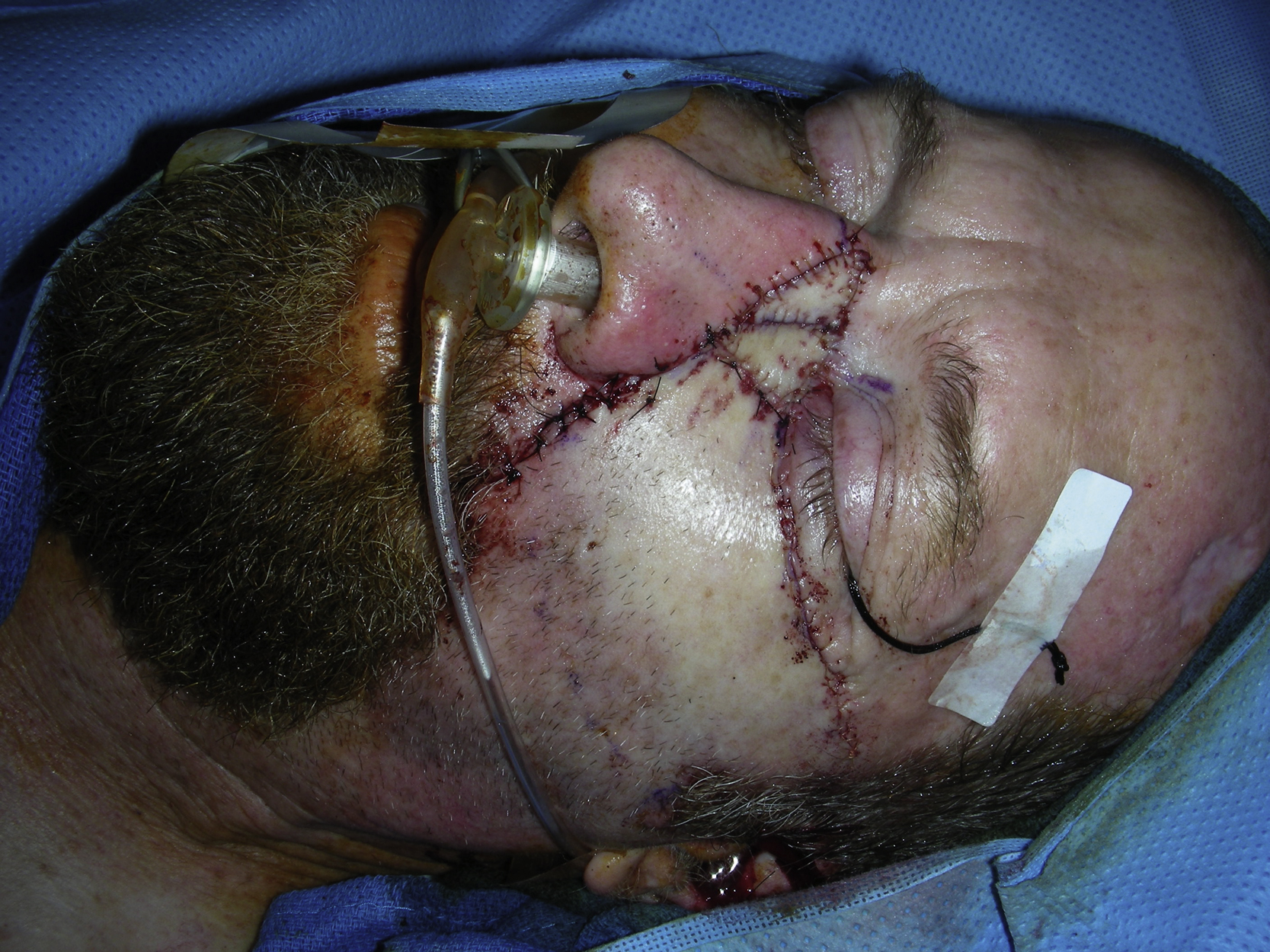 Intraoperative view showing completion after the medial cheek advancement flap reconstruction and full thickness skin graft.