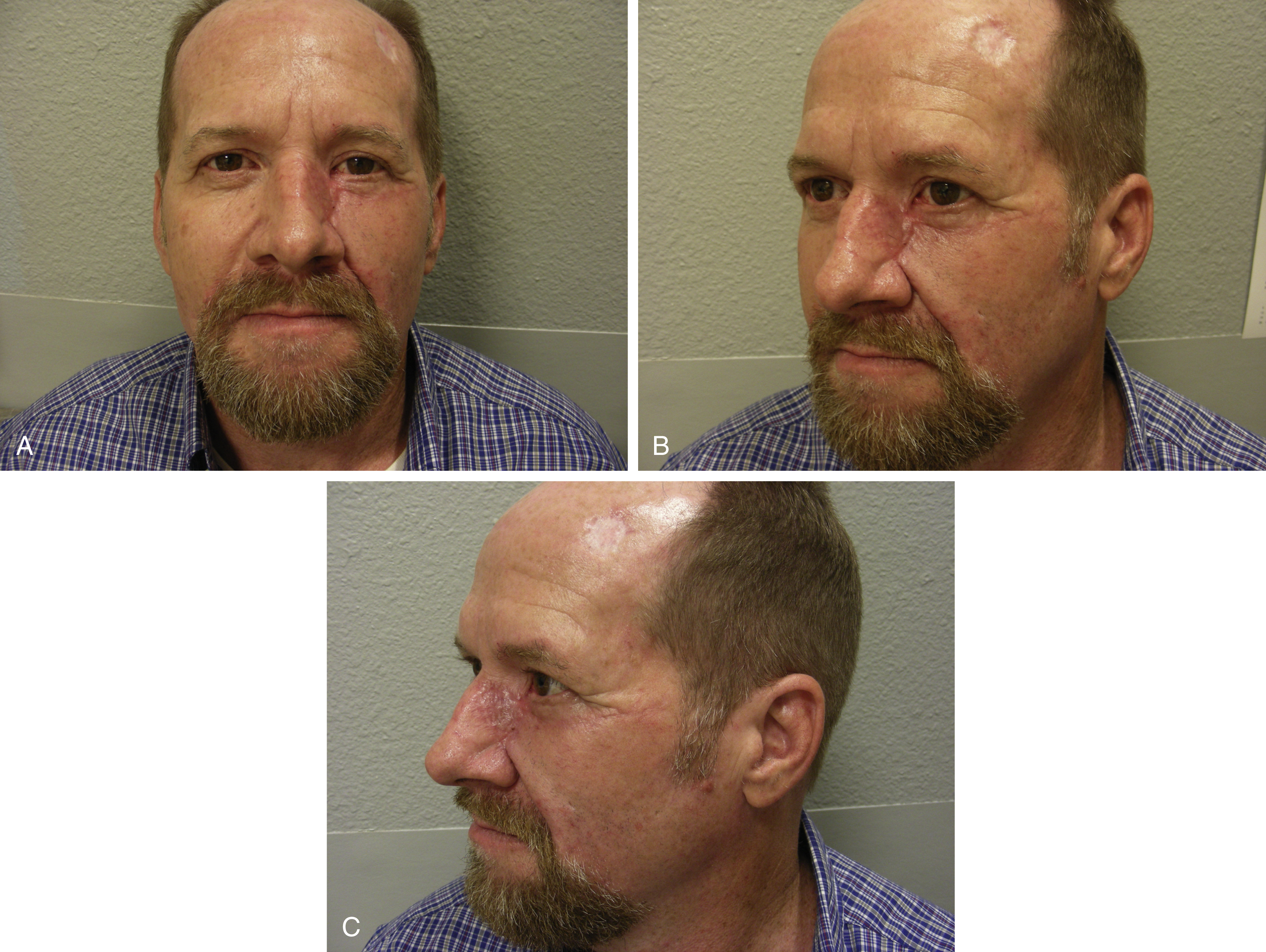 The patient did well postoperatively without any complications related to the medial cheek advancement flap. He was observed overnight in the hospital and discharged home the next day. His tie-over dressing was removed at postoperative day 5. The flap and skin graft sites both healed well. There was no entropion over his left lower eyelid ( Figs. 3.6A–C ).