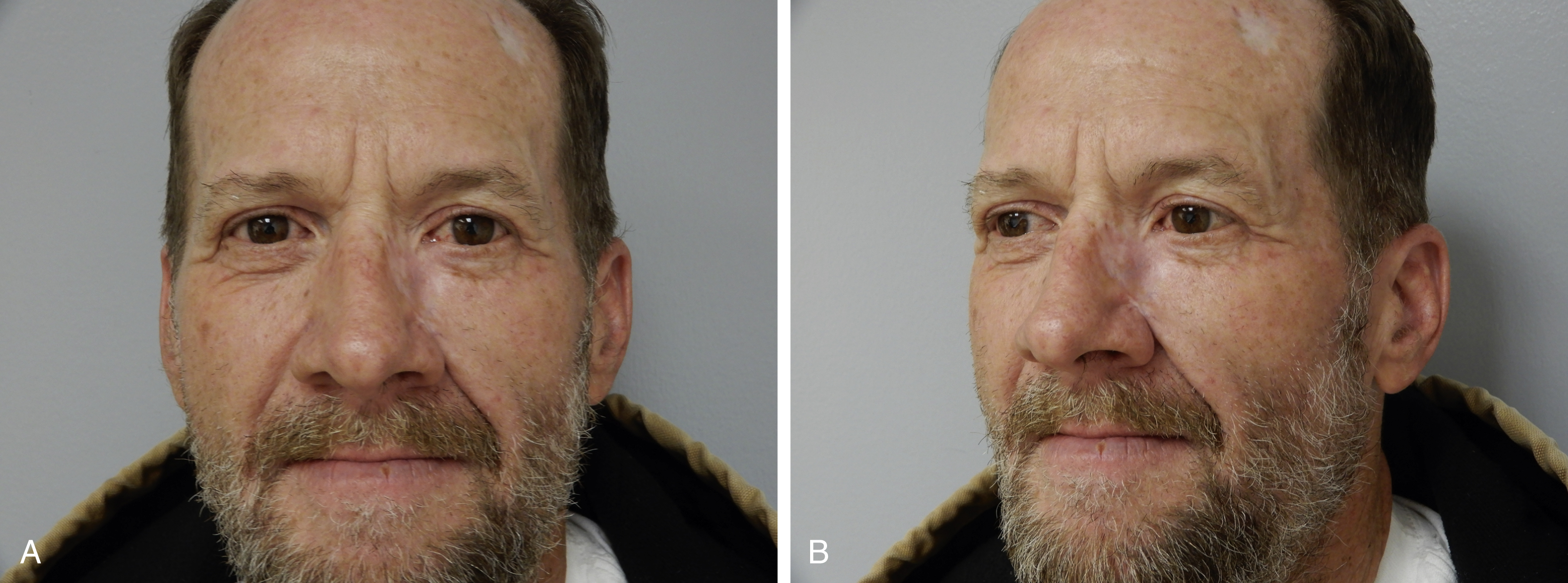 The medial cheek advancement flap to the medial cheek defect and full thickness skin graft to the nasal sidewall defect healed well without any issues. The patient has had a reasonably good cosmetic outcome and minimal scarring ( Fig. 3.7A and B ). He returned to normal life and has been followed by our demonologist for routine skin cancer follow-up.
