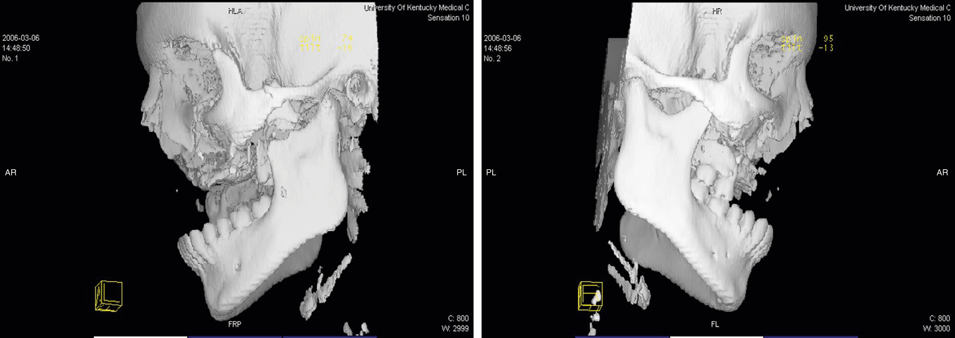 Preoperative facial CT scans showing significant portion of the maxilla missing as a result of previous trauma.