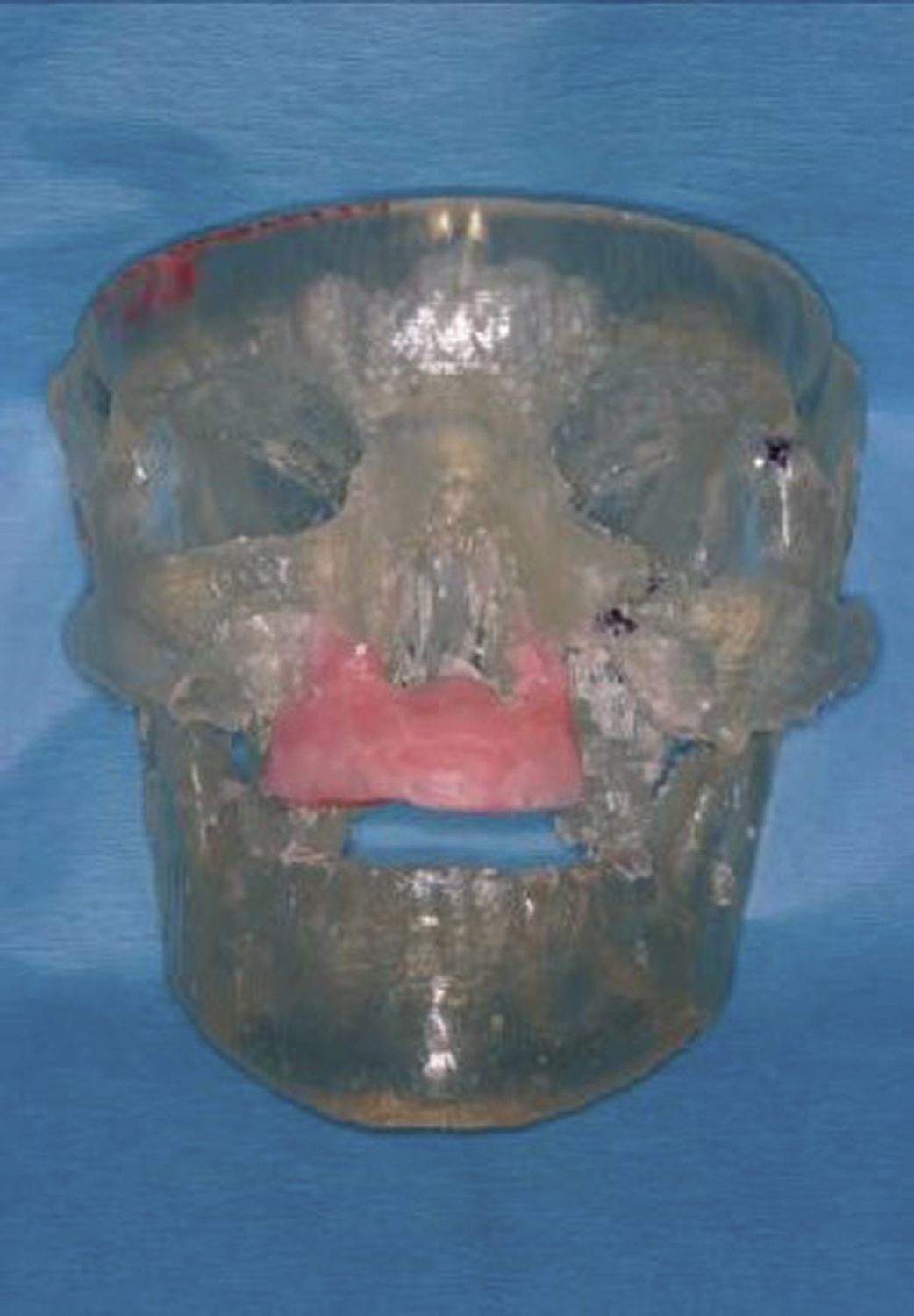 Anterior view of preoperative 3-D model showing the exact amount of missed maxilla in this patient.