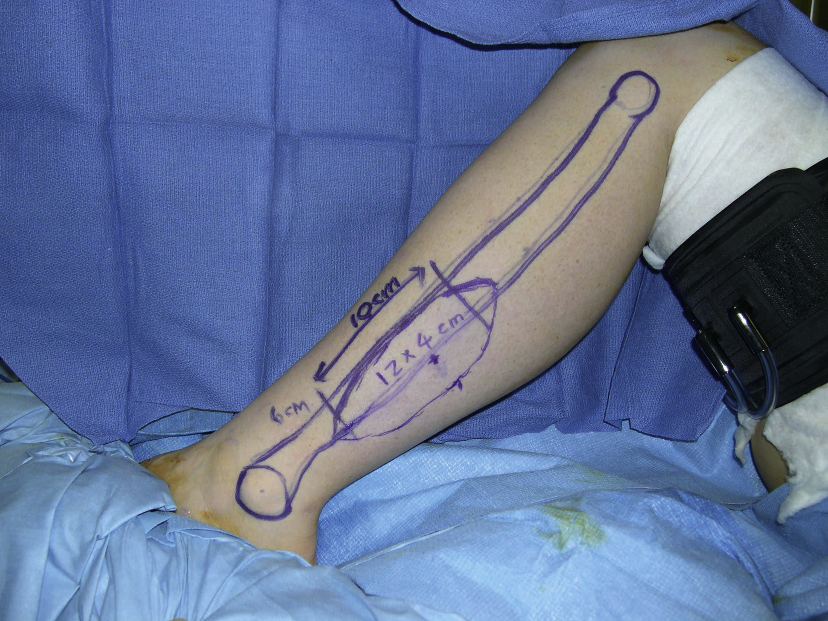 The left free fibula osteocutaneous flap was harvested by the plastic surgery service. A 12 × 4 cm of the skin paddle was designed ( Fig. 3.12 ). Under tourniquet control, the skin paddle was incised through the fascia. The subfascial dissection was performed toward the posterior intermuscular septum ( Fig. 3.13 ). Two septocutaneous perforators were identified in the septum. Attention was made to avoid direct or indirect injury to those perforators. The dissection was made to release the muscle attachment to the fibula from the soleus muscle. Once the peroneal vessels close to the fibula were identified, the distal osteotomy was performed at a level of about 6 cm proximal to the lateral malleolus. By further dissection of the hallucis longus muscle’s attachment, the peroneal vessels and the fibula were dissected free. The proximal osteotomy was then performed and a 10-cm segment of the fibula was obtained. A longitudinal skin incision was extended further toward the fibular head. Following more dissection around the pedicle, the peroneal vessels were dissected free toward its bifurcation with the posterior tibial vessels. Once the bifurcation was visualized, the pedicle was divided and the flap’s dissection was completed ( Fig. 3.14 ). With the guide of the dental model, two osteotomies were performed on the nonperiosteum attachment side ( Fig. 3.15 ).
