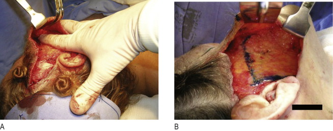 The areas to be undermined and the incisions to be made on the SMAS are marked on the skin with methylene blue. Where the midface is to be elevated, we mark the ideal point for the suture ( Figure 10.1C ). The surgery usually starts with an incision behind or in front of the ear where there will be a short scar. In the pre-auricular area usually I do a pre-tragal incision which goes into the hair to the temporal area or follows the sideburns. A combined incision in the temporal area and contouring the sideburns is also common. The retroauricular incision stops at the ear lobe or ascends following the retroauricular sulcus entering at the hairline. Commonly, skin undermining is ample and in most cases, connects the face in the submental area.
