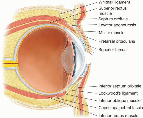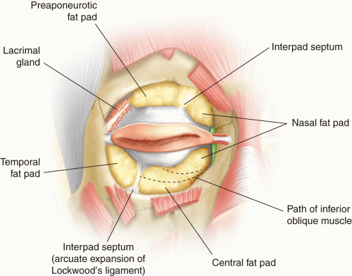 determine which patients would benefit from operative intervention and to formulate a comprehensive surgical plan. The anatomic layers of the eyelids are depicted in Figure 11.2. The layers of the upper eyelid vary dependent on the location relative to the tarsal plate. Generally, all blepharoplasty incision and dissection are performed superior to this important landmark. The layers of the upper lid in this region include the skin, orbicularis oculi muscle, levator aponeurosis, and Muller muscle. Above the levator aponeurosis, the orbital septum and orbital fat compartments lie deep to the orbicularis oculi. The supratarsal crease, usually 8 to 10 mm above the lid margin, is an important surface landmark in blepharoplasty. This crease is created by the insertion of fibers from the levator aponeurosis into the skin. This is minimally present in the Asian eyelid and is generally recreated for westernization of the upper eyelid. Deep to the orbital septum in the upper eyelid lie the medial (nasal) and central fat pads and laterally lies the lacrimal gland (Figure 11.3). Fat within the central compartment often drapes over the medial fat compartment and therefore superior retraction of the central fat will permit visualization of the medial fat pad. In addition, the medial fat is typically paler in color than the yellow central fat.