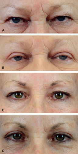 The examination must not only concentrate on the underlying pathology, but also assess the patient’s risk for postoperative complication or poor aesthetic outcome. The periorbital region must also be evaluated in the greater context of facial rejuvenation. Upper eyelid dermatochalasis (excess upper eyelid skin) is present to a varying degree in the majority of older patients. This must be distinguished clinically from blepharochalasis. This is a recurrent inflammatory pathology of the eyelid resulting in recurrent edema and fullness of the upper lid. Blepharochalasis leads to stretching, thinning, and redundancy of the upper eyelid tissue through a different mechanism. Although patients with both of these pathologies can benefit from upper blepharoplasty, a thorough history and examination is necessary to distinguish between the two etiologies. During evaluation of the upper eyelid, the presence of excess upper eyelid skin, orbicularis hypertrophy, and pseudoherniated orbital fat should be assessed. With thinning of the orbital septum, pseudoherniation of the medial and central fat compartments commonly leads to upper lid fullness and must be addressed for the optimal outcome. The locations of upper eyelid fullness should be documented at the preoperative visit and any asymmetry noted.