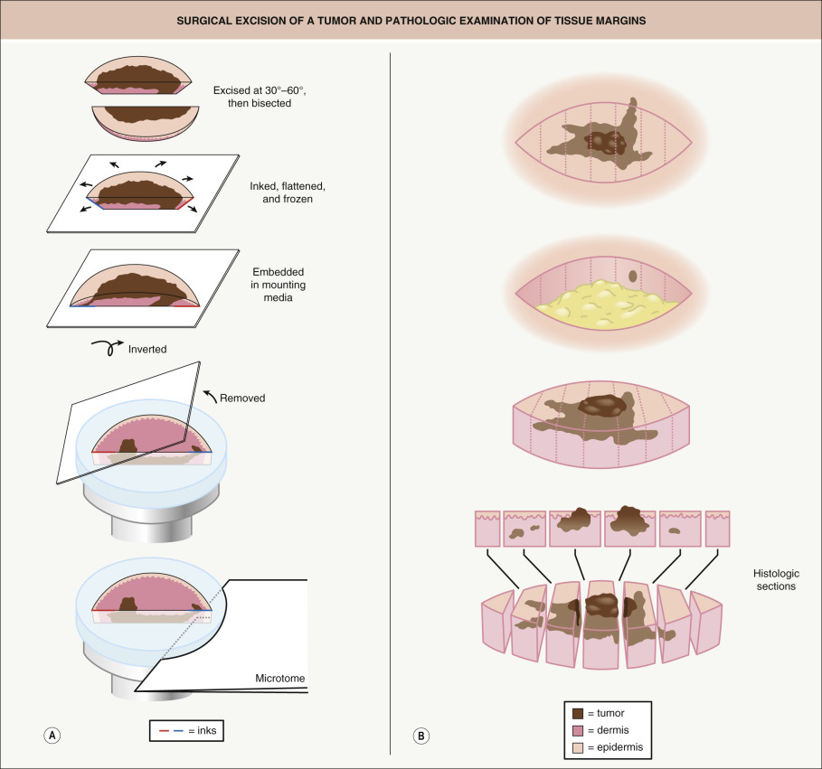 There are four major components: surgical excision, histopathologic examination, precise mapping, and wound management. The surgical component consists of removing a disc of tissue with a beveled surgical margin ( Fig. 150.1A ). The disc of tissue, or “layer”, ensures that the entire 360° of tumor margin is circumferentially removed and examined. A beveled plane of excision allows the tissue specimen sides and bottom to be flattened completely into a single plane. The histopathologic component involves removing several thin sections from the bottom of the flattened cryopreserved tissue specimen and mounting them onto glass slides, followed by staining and microscopic examination for residual tumor. This processing technique differs from standard excisions in which specimens are formalin-fixed, paraffin-embedded (FFPE) and cut in a “bread-loaf” fashion ( Fig. 150.1B ). Precise mapping entails marking any residual tumor on the map or “graph” of the excision with the remaining positive area of tumor re-excised as indicated. This three-step process is then repeated until there is no residual tumor identified microscopically. During this procedure, the Mohs surgeon has complete control of the excised tissue, including laboratory processing and interpretation of the tissue sections, as well as precise mapping. In the fourth step, wound management , the tumor-free defect is surgically closed or allowed to heal by second intention.