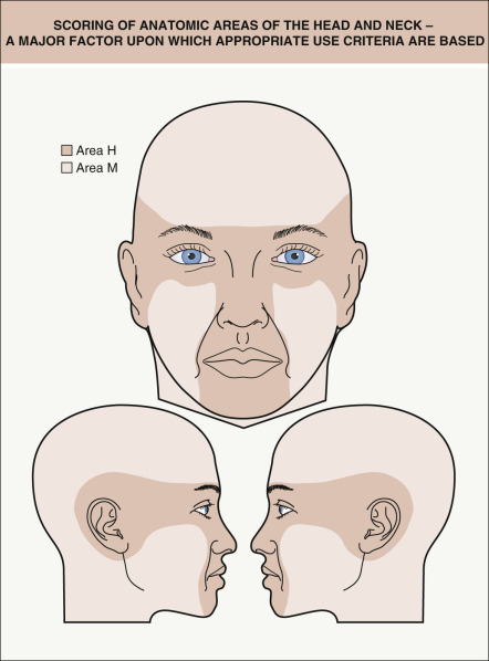 In 2012, there was a multi-society collaboration to develop appropriate use criteria (AUC) for MMS . A panel of Mohs surgeons and medical dermatologists analyzed 270 clinical scenarios in which the tumor locations ( Fig. 150.2 ), sizes, and histologic features varied as did whether or not the tumor was recurrent. The purpose of the Mohs surgery AUC was to provide guidance in the rational use of MMS and to identify tumors (e.g. actinic keratoses, superficial BCCs on the trunk) that did not require MMS treatment . The Mohs surgery AUC are available via a dedicated website ( www.aad.org/education/appropriate-use-criteria/mohs-surgery-auc ) as well as the Mohs AUC app. Additionally, one can refer to NCCN guidelines for the treatment of cutaneous malignancies .
