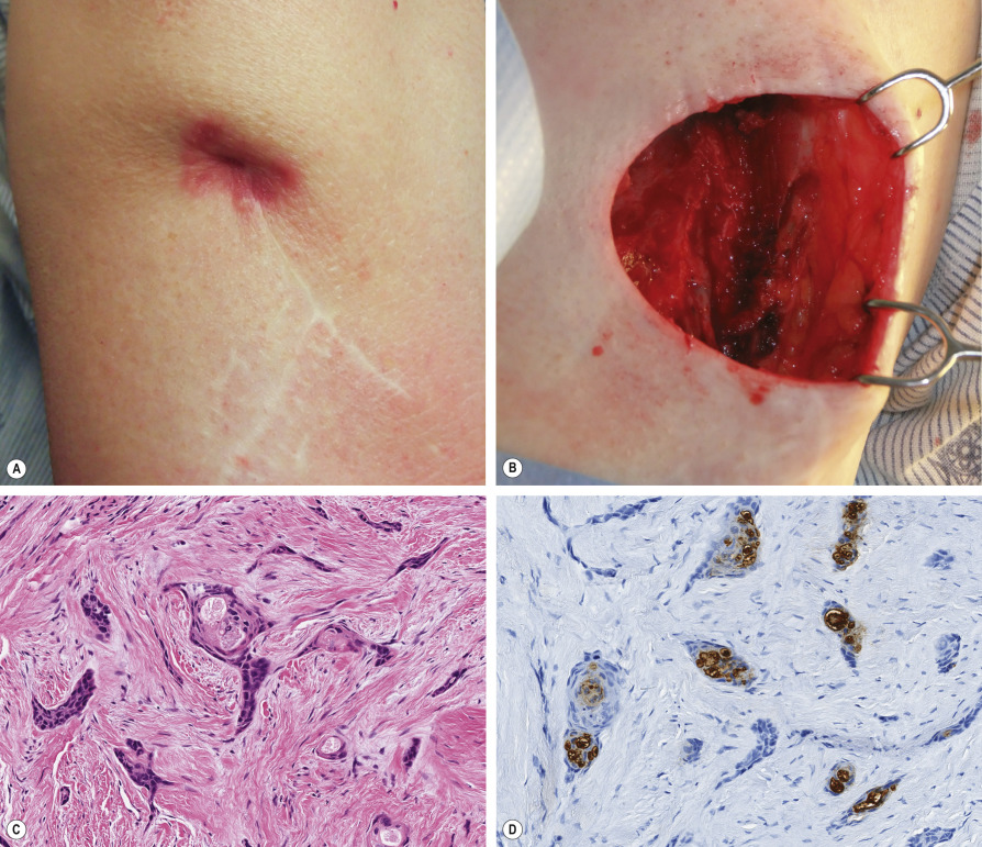 This group consists of the uncommon tumors that have sweat gland (eccrine, apocrine), sebaceous gland, or follicular differentiation and includes mucinous eccrine carcinoma, eccrine porocarcinoma, adenoid cystic carcinoma, papillary eccrine carcinoma, and extramammary Paget disease (EMPD). Except for EMPD of the groin or sebaceous carcinoma of the eyelid, the clinical features are rarely diagnostic . As a group, these tumors are locally destructive with extensive unpredictable local tissue invasion, have a high rate of local recurrence when treated by wide excision, and metastasize late in the course of the disease. Typically, their microscopic features are readily recognizable in frozen sections so they are amenable to MMS. Rapid immunohistochemistry can aid in diagnosis (see Table 150.4 ). IHC staining of FFPE sections can also serve to confirm the initial diagnosis as well as margin clearance.