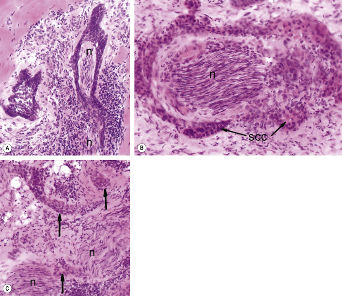 MMS is indicated for management of SCCs with one or more risk factors for recurrence or metastasis (see Table 150.1 ). These indications include large SCCs (>2 cm), recurrent tumors, incompletely excised SCCs, and tumors with ill-defined clinical margins, rapid growth, an aggressive histologic subtype, and/or perineural invasion ( Fig. 150.3 ), as well as SCCs arising in chronic scar tissue . The latter, termed Marjolin ulcers, can behave aggressively, and a multidisciplinary approach with regional node assessment and reconstruction may be necessary in these patients. Numerous, rapidly arising SCCs may affect immunosuppressed solid organ and hematopoietic stem cell transplant recipients or individuals with chronic lymphocytic leukemia, and MMS is well suited for the management of these neoplasms.