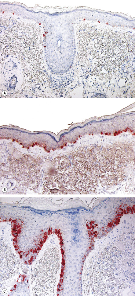 Since lentigo maligna (melanoma in situ of sun-damaged skin) may be a clinically and histologically ill-defined tumor, it has a high local recurrence rate with standard wide-excisional surgery. Although frozen section histology of lentigo maligna can be challenging, MMS offers the possibility of complete margin examination and tissue sparing. Immunohistochemical (IHC) staining of frozen sections (see below) may improve diagnostic accuracy . Because of the challenge of detecting atypical melanocytes in frozen sections, some surgeons employ techniques such as wide excision Mohs surgery, “slow” Mohs staged excision (utilizing FFPE sections), and geometric staged excision (see Variations) .