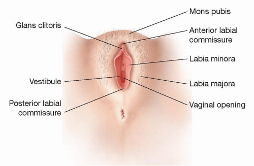 The vulva includes the mons pubis, labia majora, labia minora, vaginal vestibule, and bulb of the vestibule (FIG 1).
