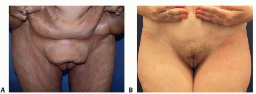 FIG 2 • A. Mons pubis in MWL demonstrates significant ptosis and excess fat. B. Abdominoplasty with removal of the upper part of the mons pubis will allow a rejuvenated appearance.