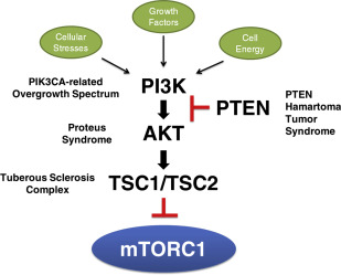Somatic mutations in any of the genes in the PI3K/PTEN/AKT/TSC/mTORC1 signaling pathway ( Fig. 1 ) may result in a spectrum of abnormal growth, ranging from an isolated small skin lesion with minimal or no overgrowth to extensive skin involvement with striking extremity enlargement and tumor susceptibility. Proteus syndrome, caused by mutations in AKT1 , and the PIK3CA -related overgrowth spectrum (PROS) may be considered archetypal mosaic disorders, given the patchy distribution of disease features. Tuberous sclerosis complex (TSC), caused by mutations in either TSC1 or TSC2 , and PTEN hamartoma tumor syndrome (PHTS) are most frequently associated with germline mutations, but mosaic forms also appear as isolated (simplex or sporadic) occurrences. This article primarily focuses on these entities, chosen for their shared abnormalities in a signaling pathway and analogous or overlapping phenotypes.