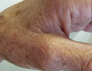 Localized cutaneous mucin deposition results in translucent pale to erythematous papules, as in digital myxoid cysts or focal cutaneous mucinosis. Papular mucinosis related to plasma cell dyscrasia with paraproteinemia causes papules with a distinct tendency to form linear arrays. Histologically, mucin is less apparent than an increase in fibroblasts and ropey collagen. This translates to induration of the skin over time, leading to a clinical appearance resembling systemic sclerosis.
