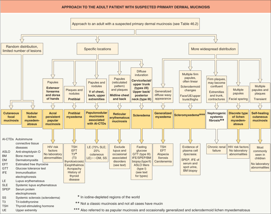 The cutaneous mucinoses are a heterogeneous group of disorders characterized by an abnormal accumulation of mucin within the skin. While the precise pathogenesis is unknown, cytokines (e.g. TNF, interleukin-1, transforming growth factor (TGF)-β) and/or polyclonal and monoclonal immunoglobulins may induce the synthesis of glycoaminoglycans. The cutaneous mucinoses are divided into: (1) primary mucinoses, in which the mucin deposition leads to clinically distinctive lesions and is the major histologic feature; and (2) secondary mucinoses, in which the mucin deposition is simply an associated finding. Primary mucinoses are further divided into degenerative–inflammatory forms (dermal or follicular) and hamartomatous–neoplastic forms. Major associated disorders include paraproteinemia (scleromyxedema, scleredema), diabetes mellitus (scleredema), thyroid disease (pretibial myxedema, generalized myxedema), and autoimmune connective tissue disease (lupus erythematosus, dermatomyositis).