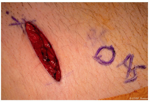 5-cm incision is centered obliquely over the anterior iliac inferior spine (Figure 36.2)