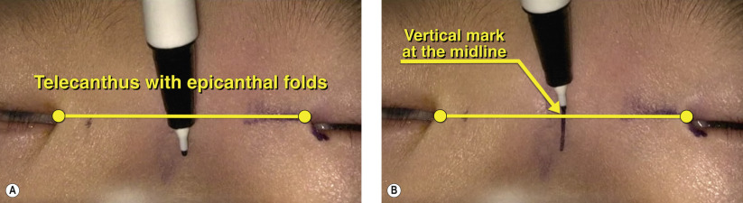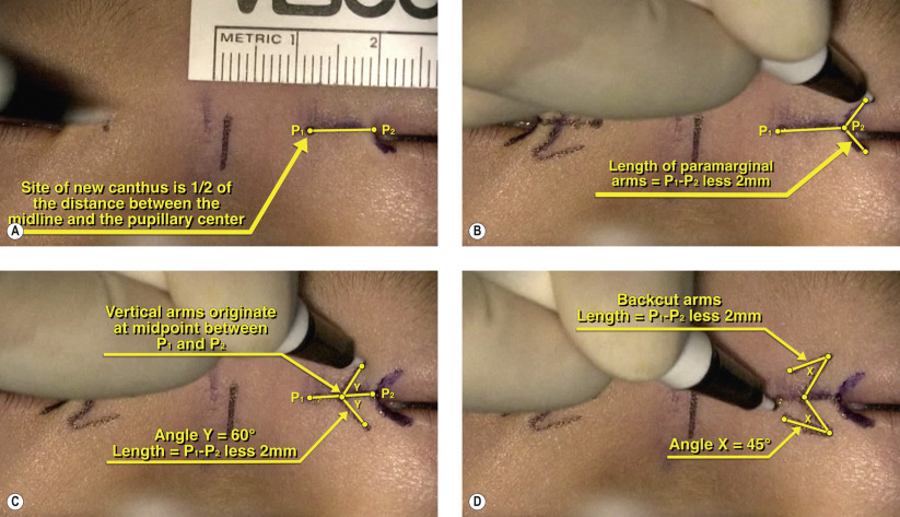 Mustardé’s technique of epicanthoplasty is indicated for the treatment of epicanthal inversus associated with moderate to severe telecanthus. Mustardé’s epicanthoplasty involves transposition of 4 Z-plasty flaps in conjunction with medial canthal tendon anchoring to the periosteum. In contrast, root Z-epicanthoplasty ( Chapter 7 ) addresses the epicanthus but does not alter the position of the medial canthi. Mustardé’s epicanthoplasty involves longer and more complex incisions and places the tissues under more tension, potentially resulting in higher scar-related complications necessitating a discussion with the patient and family.
