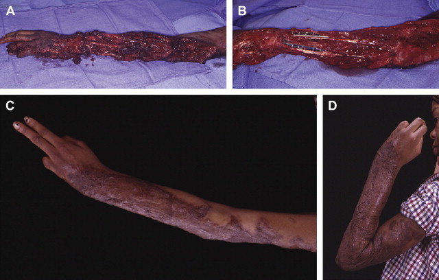 ( A–D ) Irrigation and debridement remains the mainstay of the initial surgery. The wounds are treated like a pseudotumor, removing all devitalized tissue and contamination. Coverage can be delayed until the surgeon thinks the wound is stable with minimal risk of infection and viable tissue demarcation.