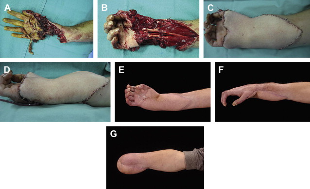 ( A , B ) A 38-year-old man who sustained a severe near-amputation crush injury to his right hand. Segmental loss of tendons, nerves, and soft tissue were reconstructed using vein grafts for revascularization, tendon grafts, and nerve grafts. ( C , D ) A perforator anterolateral thigh free flap was used to cover the soft tissue defect. ( E , F ) Because of the severe crush injury mutilation to the hand, function was not restored. The hand was painful and motionless. ( G ) Patient opted for an amputation and prosthesis fitting instead of the useless dysfunctional hand.