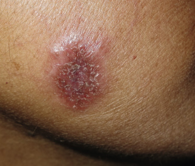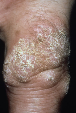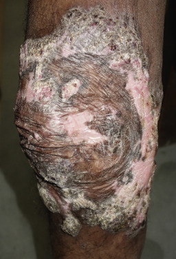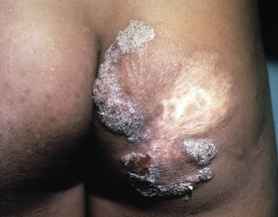 Tuberculosis (TB) is more prevalent in the developing countries, especially those with particularly high rates of human immunodeficiency virus (HIV)–positive populations. The classification system of cutaneous TB depends on how the infection was acquired, and these four forms include many different cutaneous lesions. Examples of these four categories include 1) verrucous papules or plaques of primary inoculation TB (TB verrucosa cutis); 2) masses and nodules with possible suppuration and ulceration overlying infected lymph nodes representing endogenous, contiguous spread; 3) widespread macules, papules, pustules, nodules, or purpura seen in miliary TB from hematogenous spread; and 4) persistent nodules of the posterior lower calf representing a lobular panniculitis known as erythema induratum , a form of a tuberculid. These cutaneous manifestations of TB, along with the many other specific and nonspecific findings, should prompt testing including skin biopsy, tissue culture, screening with blood testing if available such as QuantiFERON-Gold, tuberculin skin testing, and in some, a chest x-ray.
