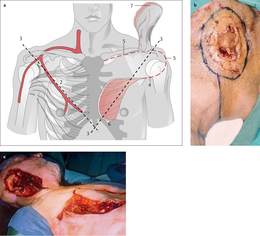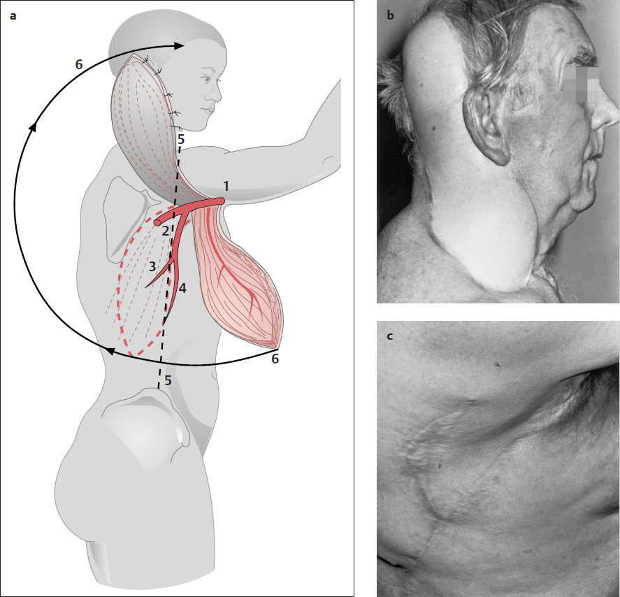 a–c Myocutaneous latissimus dorsi island flap. a 1 Axillary artery. 2 Subscapular artery. 3 Circumflex scapular artery. 4 Thoracodorsal artery. The flap is raised behind a line from the center of the iliac crest to the anterior axillary fold (5). The flap is based on the thoracodorsal artery (4). The initial incision is made over the anterior border of the latissimus dorsi muscle, following the line shown (5). The very large flap has a long arc of rotation (6) that can reach all head and neck defects (see text). b Coverage of the scalp, postauricular region, and neck, with a latissimus dorsi island muscle flap following melanoma resection. c Donor site after completion of healing (surgeon S. Remmert).