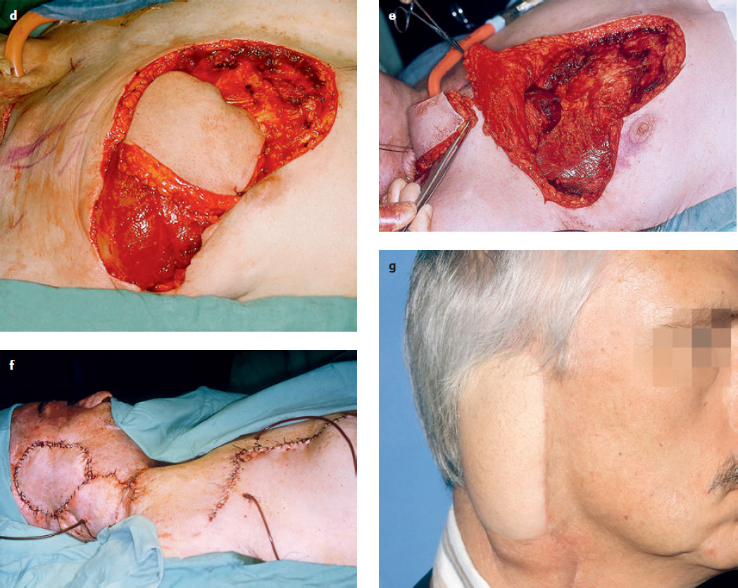 a–g a Myocutaneous pectoralis major island flap. 1 Axillary artery. 2 Thoracoacromial artery. 3 Ariyan’s line. 4 Incision for raising the flap (deltopectoral flap design). 5 Incision for a deltopectoral flap (see Fig. 13.1 ). 6 Incision outlining the myocutaneous flap. 7 Length of the flap. b Tumor of the auricular region. c Reconstruction of the auricular region after tumor resection and petrosectomia. d, e The island flap is prepared and pulled through the skin bridge (a 5). f The defect is covered and the wounds closed. g Result.